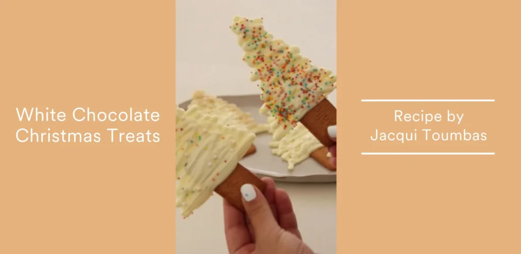 Place the Malt O Milk biscuits on a baking tray lined with baking paper. Drizzle melted white chocolate onto each biscuit in the shape of a Christmas tree (a simple triangle with a trunk works well).